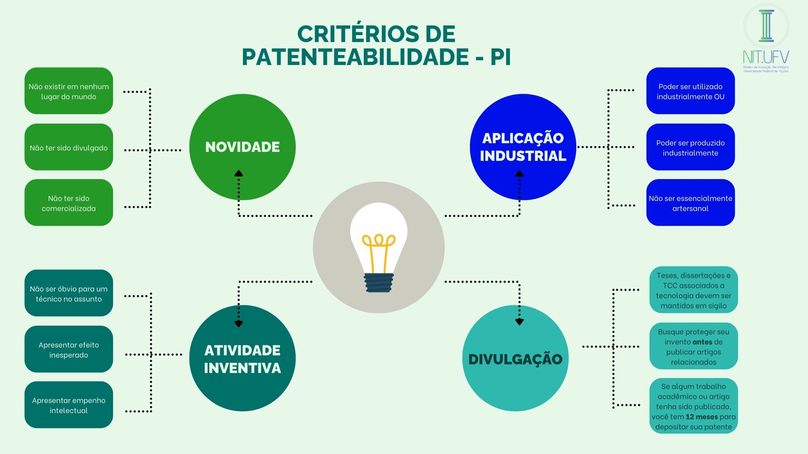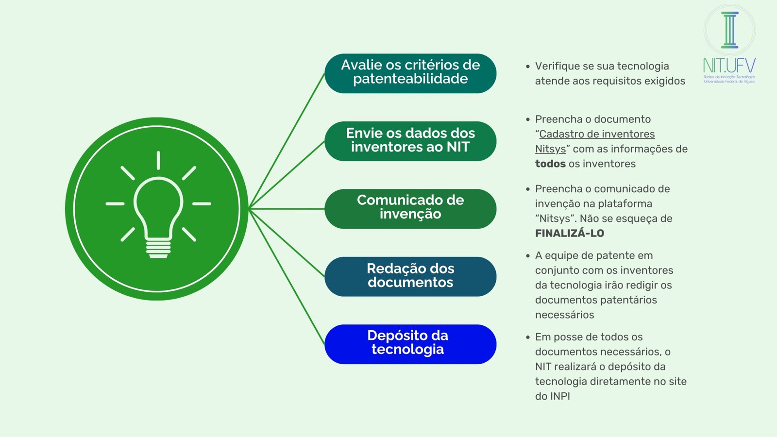 O NIT.UFV atua na elaboração, depósito e acompanhamento dos pedidos de patentes dos pesquisadores da universidade. O NIT.UFV também auxilia na redação e acompanhamento de pedidos de patente de inventores independentes de viçosa e região.